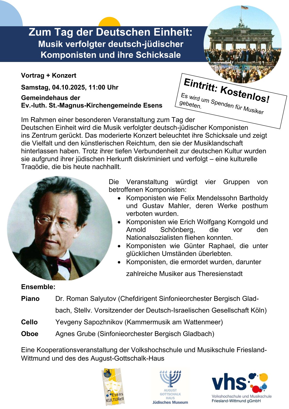 Der Ökumenische Arbeitskreis Juden und Christen in Esens e. V., die VHS Friesland-Wittmund gGmbH und Esens KULTURell laden zu Konzert und Vortrag ein.